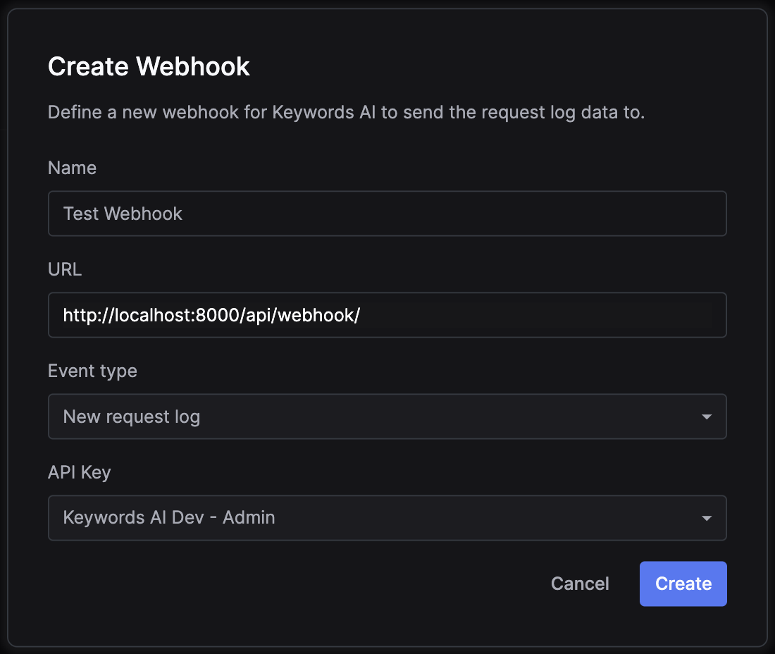 New request log(when an API call is logged). - Define the API Key you want to associate this webhook with. In this demo, it is an admin development key.