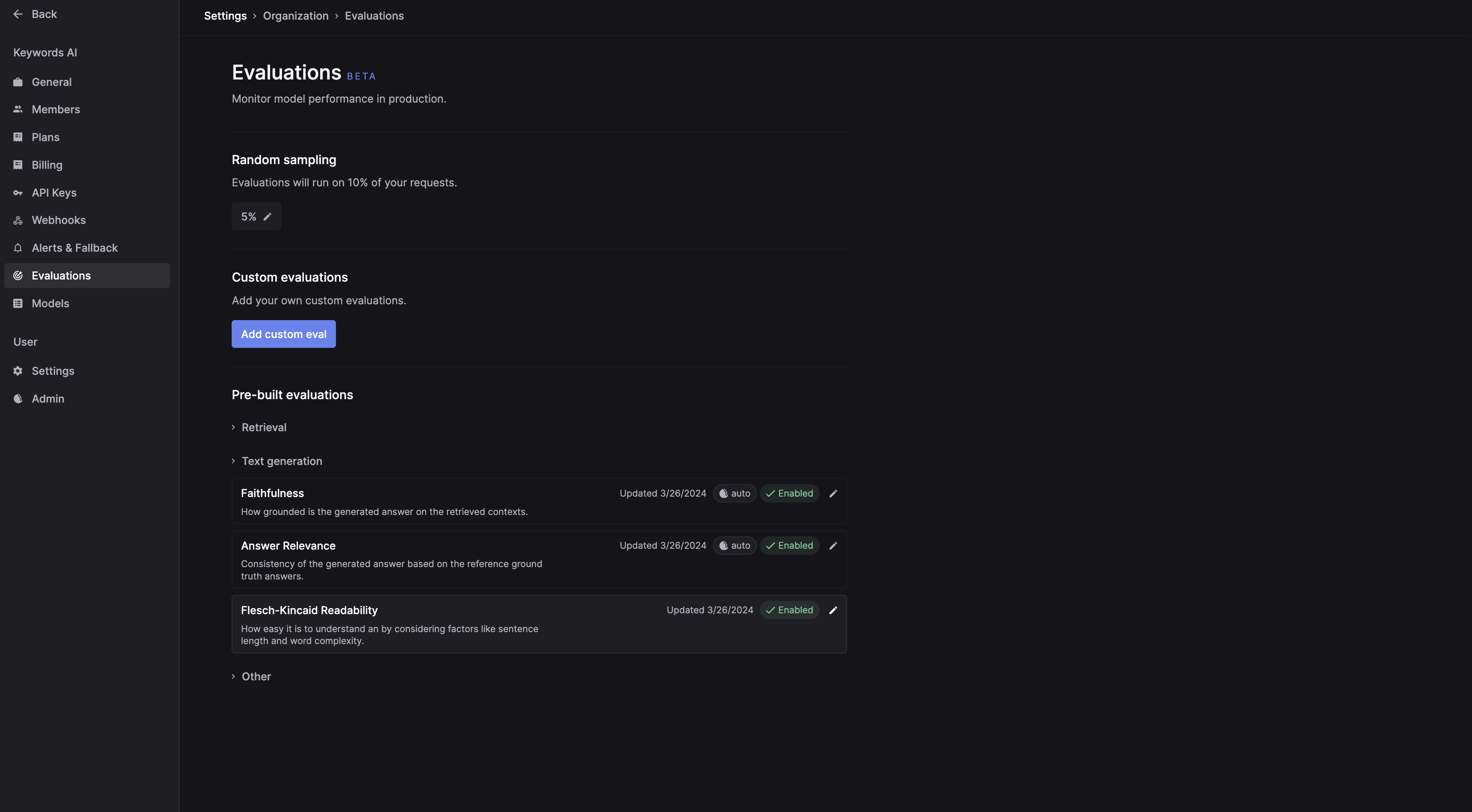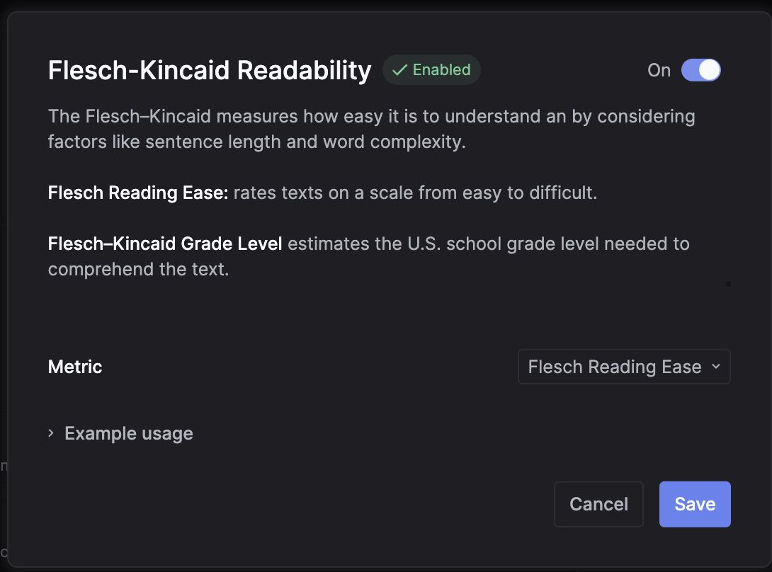 - Go to Respan (on top of the left nav bar) > Evaluation > Text generation > Flesch–Kincaid